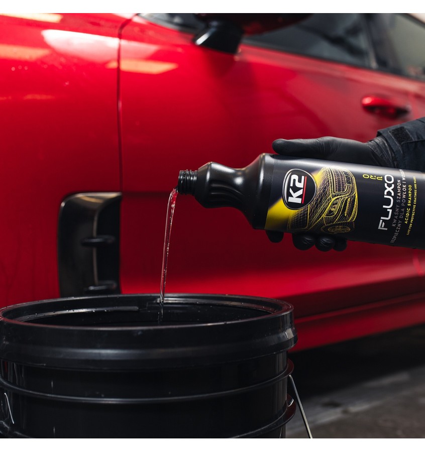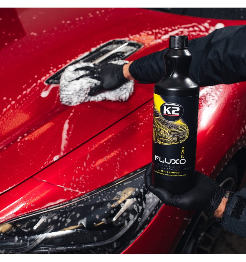K2 Fluxo Pro to silnie skoncentrowany, niskopienny szampon o kwaśnym pH (pH ~4), stworzony z myślą o profesjonalnej pielęgnacji samochodów zabezpieczonych powłokami ceramicznymi, kwarcowymi lub woskami. Jego unikalna, pozbawiona zbędnych dodatków formuła skutecznie usuwa zanieczyszczenia, w tym osady mineralne, przywracając powłokom ich pierwotne właściwości hydrofobowe i głęboki połysk. Doskonale nadaje się do oczyszczenia lakieru przed aplikacją powłok ochronnych.