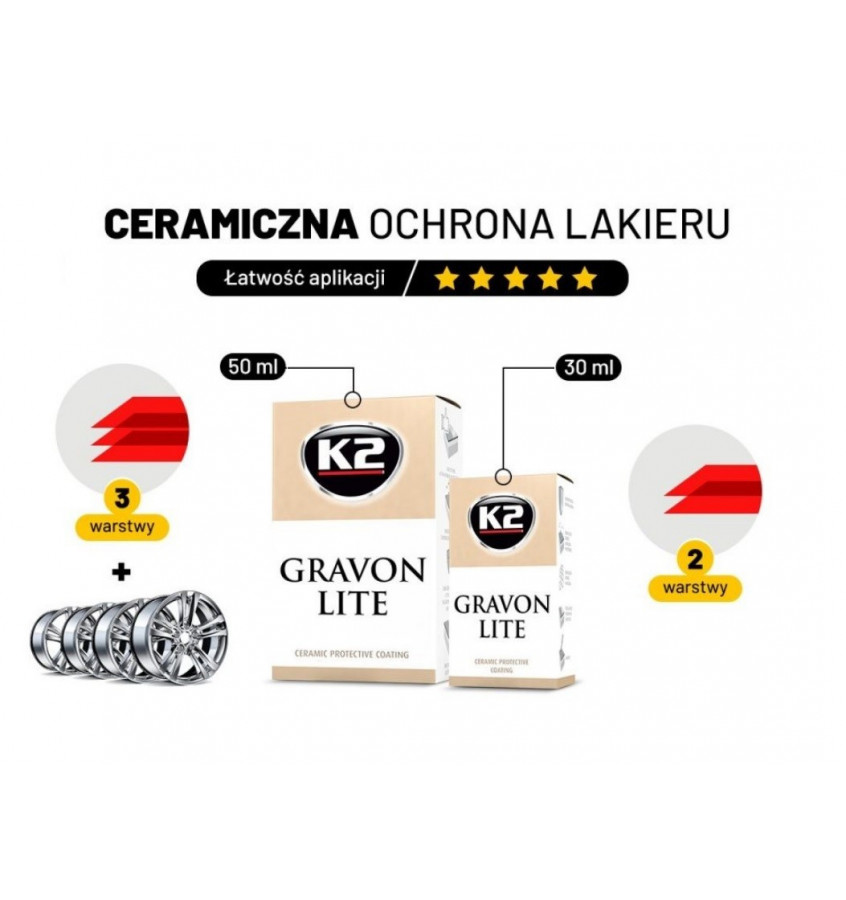 K2 Gravon Lite to najprostsza oraz najszybsza w aplikacji powłoka ceramiczna, która zabezpieczy lakier przed zarysowaniami, zabrudzeniami, promieniami UV oraz innymi czynnikami zewnętrznymi.Powłokę można nakładać warstwowo zwiększając ochronę z każdą kolejną warstwą nawet do 2 lat.