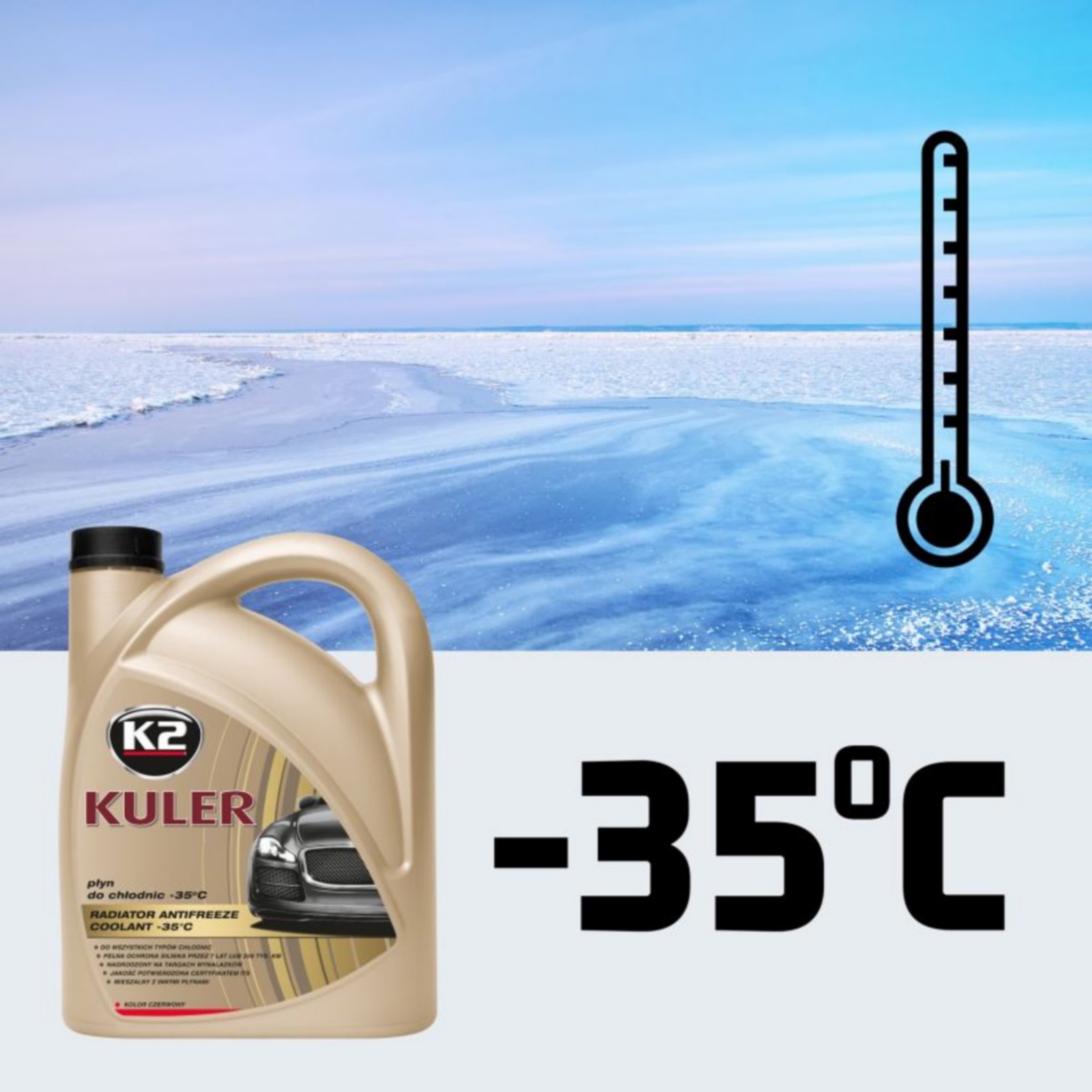 Specjalnie opracowana receptura K2 Kuler -35°C chroni silnik latem przed przegrzaniem, a zimą przed zamarzaniem, zapewniając jego optymalną temperaturę pracy przez cały rok. Z K2 Kuler silnik jest zawsze w formie.