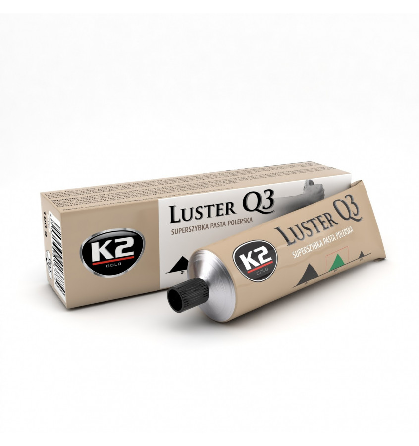 K2 LUSTER Q3 to pasta do maszynowego polerowania lakieru. Usuwa rysy po papierze ściernym, myjniach automatycznych, zmatowienia, skórkę pomarańczową, oksydację, hologramy, przebarwienia. Doskonale nadaje się do polerowania świeżo nałożonych lakierów oraz do renowacji starych, zniszczonych powłok. Wytwarza mało ciepła podczas pracy, przez co nie przegrzewa powierzchni. Daje doskonałe efekty podczas stosowania w tzw. jednym kroku – tj. 1 cykl polerowania z 1 gąbka. W większości przypadków nie są potrzebne żadne dodatkowe czynności. Pasta przeznaczona jest do polerowania: lakierów samochodowych wszelkiego rodzaju, lakierów przemysłowych, reflektorów, celulozy, mebli, powierzchni syntetycznych, akryli i wielu innych.