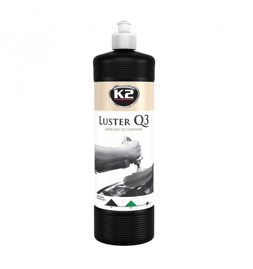 K2 LUSTER Q3 ZIELONY to pasta do maszynowego polerowania lakieru. Usuwa rysy po papierze ściernym, myjniach automatycznych, zmatowienia, skórkę pomarańczową, oksydację, hologramy, przebarwienia. Doskonale nadaje się do polerowanie świeżo nałożonych lakierów oraz do renowacji starych, zniszczonych powłok. Wytwarza mało ciepła podczas pracy, przez co nie przegrzewa powierzchni. Daje doskonałe efekty podczas stosowania w tzw. jednym kroku – tj. 1 cykl polerowania z 1 gąbką. W większości przypadków nie są potrzebne żadne dodatkowe czynności. Przeznaczona do polerowania: lakierów samochodowych wszelkiego rodzaju, lakierów przemysłowych, reflektorów, celulozy, mebli, powierzchni syntetycznych, akryli i wielu innych.