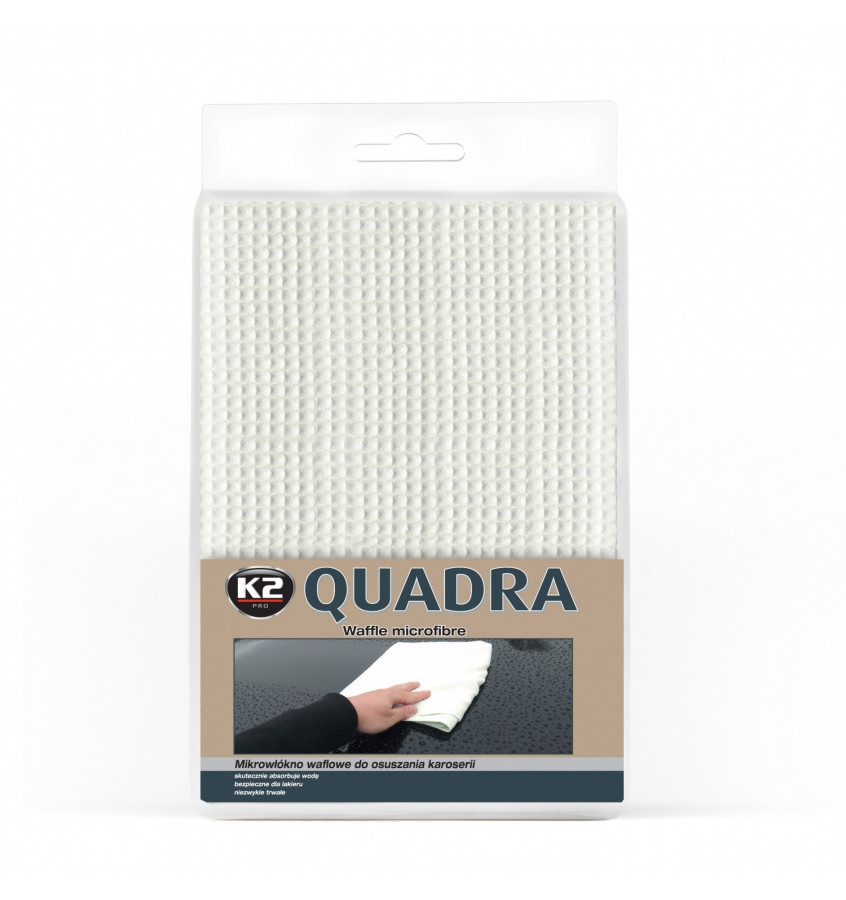 K2 QUADRA MIKROFIBRA WAFLOAE umożliwia szybkie i dokładne osuszenie karoserii samochodu. Dzięki specjalnej strukturze wafla, absorbuje wodę skuteczniej niż tradycyjne mikrowłókna. Nie pozostawia smug oraz nie powoduje powstawania rys na lakierze. Mikrowłókno jest przeznaczone do myjni samochodowych. Można je wielokrotnie prać i suszyć.