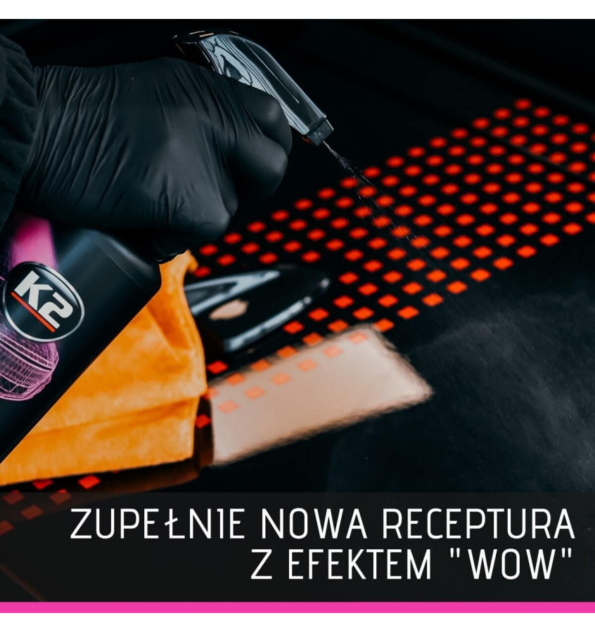 Quick detailer K2 na lakierach zabezpieczonych woskiem, wzmacnia powłokę ochronną i przedłuża jej trwałość. Lakierom niezabezpieczonym nadaje połysk i ochronę do kolejnego mycia.