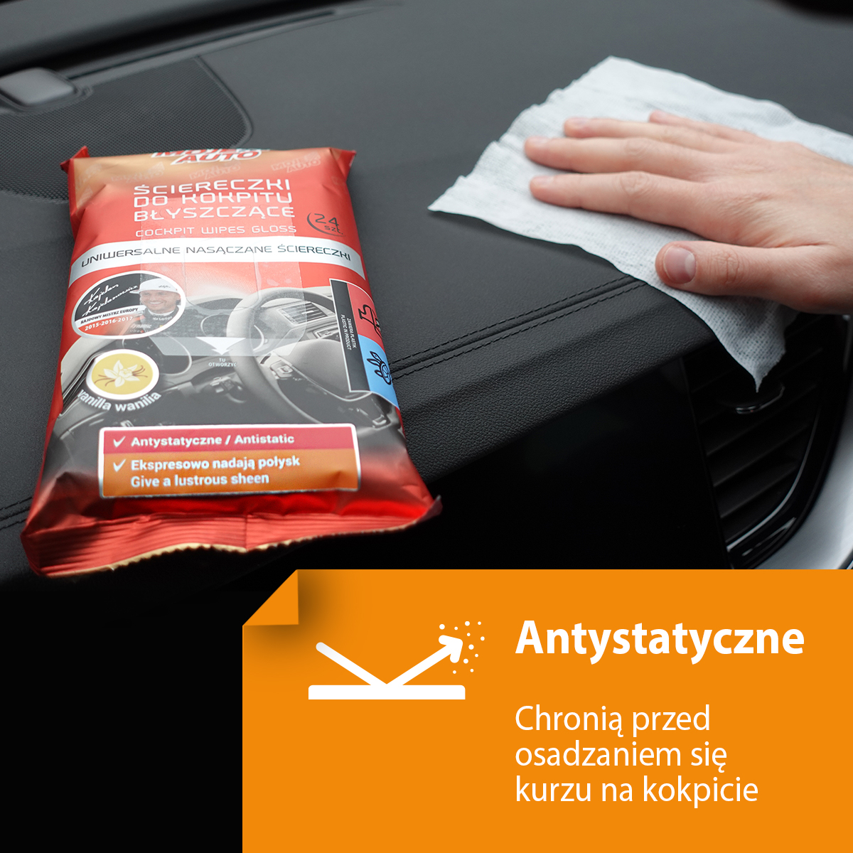 Nasączane ściereczki do czyszczenia kokpitu błyszczącego o zapachu wanilii. Ekspresowo nadają połysk. Antystatyczne. Wygodne w użyciu. Opakowanie gwarantujące trwałość.