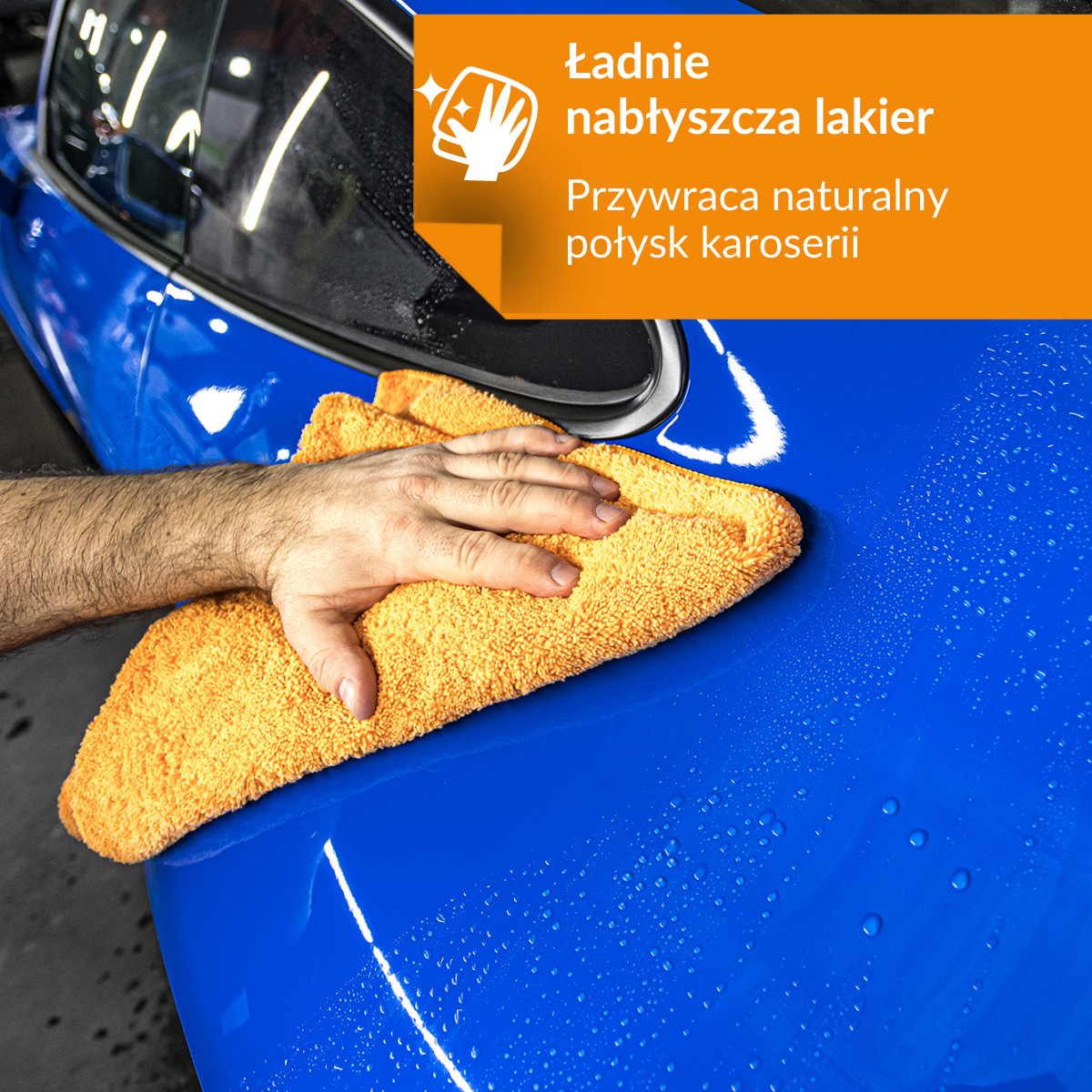 Wosk nabłyszczający do stosowania na mokry lakier o potrójnym działaniu. Przyspiesza wysychanie samochodu po umyciu, doskonale nabłyszcza lakier, przywraca naturalny połysk, chroni przed działaniem niekorzystnych czynników atmosferycznych. Szybki, skuteczny w działaniu, gwarantuje utrzymanie lakieru w doskonałym stanie. Do wszystkich rodzajów lakieru.