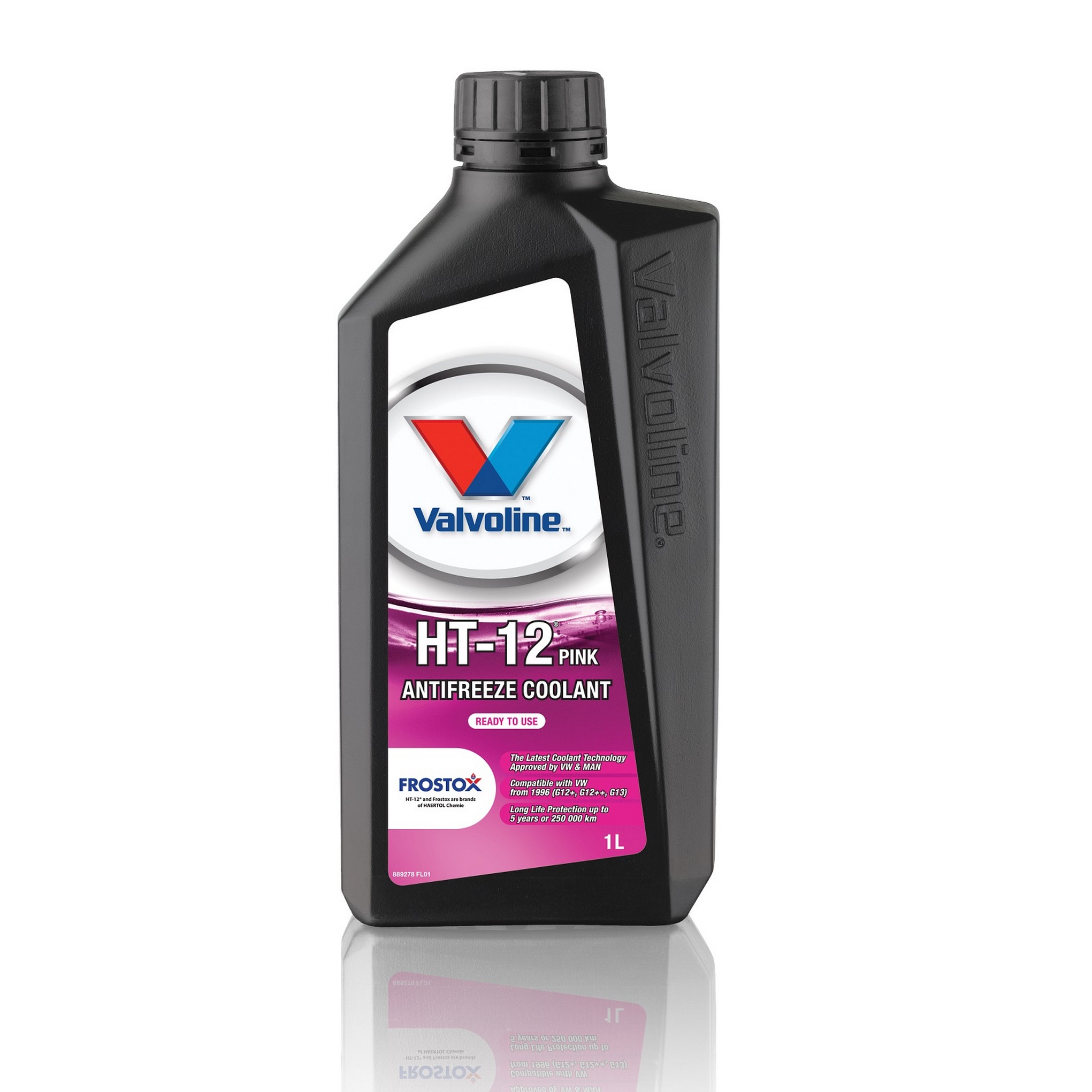 Poziomy jakości Cummins CES 14603, CES 14439 CUNA NC 956-16 Deutz DQC CC-14 GB 29743-2013 JIS K 2234:2006 ONORM V 5123 PN-C40007:2000 SANS 1251:2005 VW TL 774-C/D/F/G/J MAN 324 NF / SNF / Typ Si-OAT Aprobaty VW TL 774-L (G12evo) MAN 324 Si-OAT evo Poziomy jakości ASTM D3306 ASTM D4985 ASTM D6210 AS 2108-2004 BS 6580:2010 Opatentowana formuła zapewniająca najwyższej jakości ochronę Valvoline HT-12 Pink to zatwierdzony przez producentów OEM wysokiej jakości płyn chłodzący zapewniający doskonałą ochronę najważniejszych części silnika m.in. kanałów chłodniczych w bloku silnika, głowic cylindrów, chłodnicy i pompy wody przed korozją, przegrzaniem i zamarzaniem. Zawiera wysokiej jakości środek przeciwpieniący i nie wywiera szkodliwego wpływu na uszczelki, węże, elementy plastykowe i oryginalny lakier pojazdu. *Patent nr EP2744869B1 Zastosowania Modele samochodów VW od roku 1996 (wymagające płynów spełniających specyfikacje G12+, G12++ i G13). Płyn chłodzący Valvoline HT12 Pink można mieszać we wszystkich proporcjach z innymi płynami chłodzącymi G12++ i G13. Płyn chłodzący zatwierdzony przez producenta Preparat Valvoline HT-12 Antifreeze Coolant Pink jest zatwierdzony przez firmę Volkswagen jako zgodny ze specyfikacją VW TL 774-L (G12evo) oraz firmą MAN jako zgodny ze specyfikacją MAN 324 SiOAT evo.