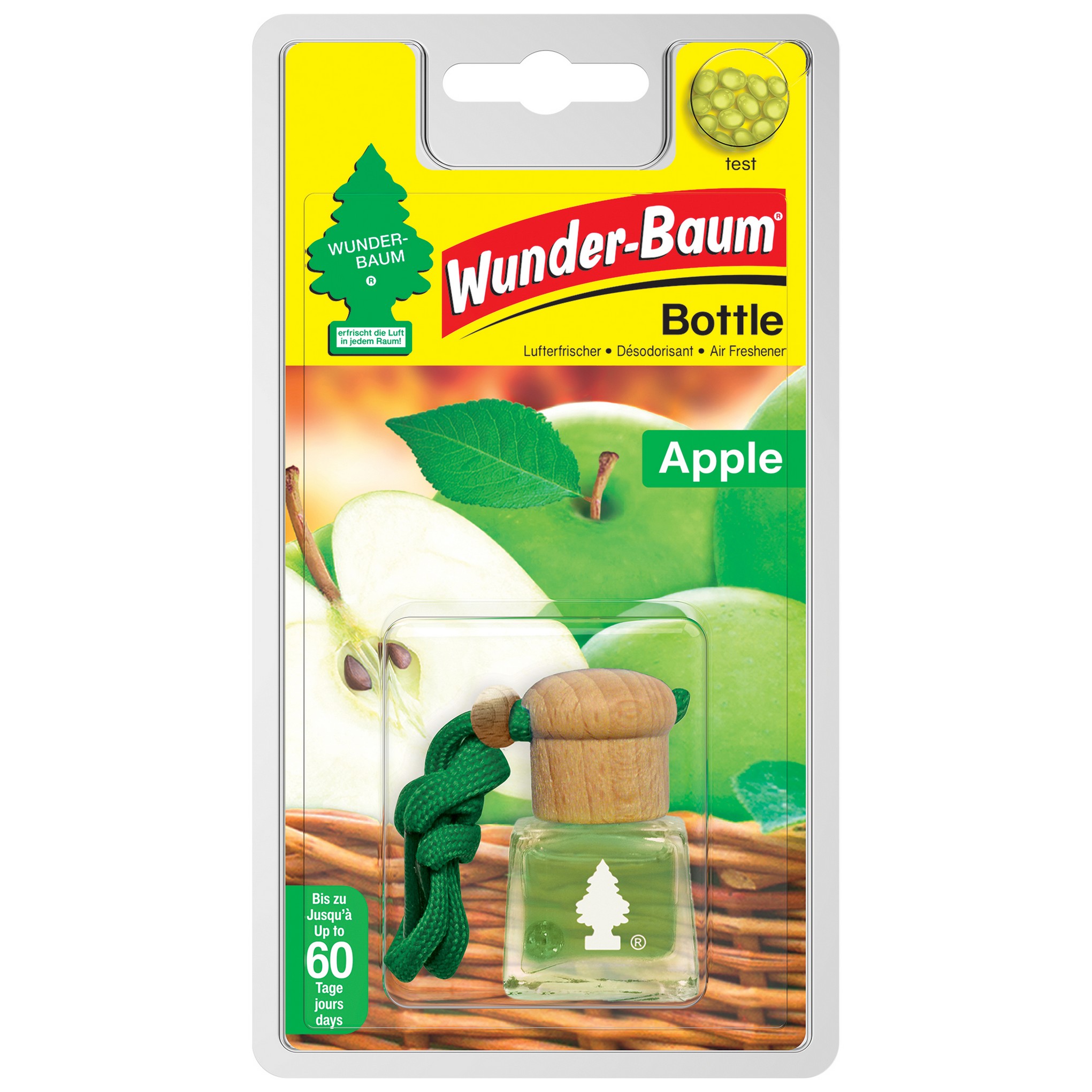 Odświeżacz powietrza w buteleczce. O zapachu jabłka. Działa do 12 tygodni. Tester zapachu wbudowany do opakowania. Widoczna przez szkło substancja zapachowa i estetyczna nasadka sprawiają, że produkt jest pachnącą ozdobą każdego lusterka wstecznego. Drewniana nasadka wchłania olejek i stopniowo uwalnia zapach, gwarantując długotrwałe działanie produktu do 12 tygodni