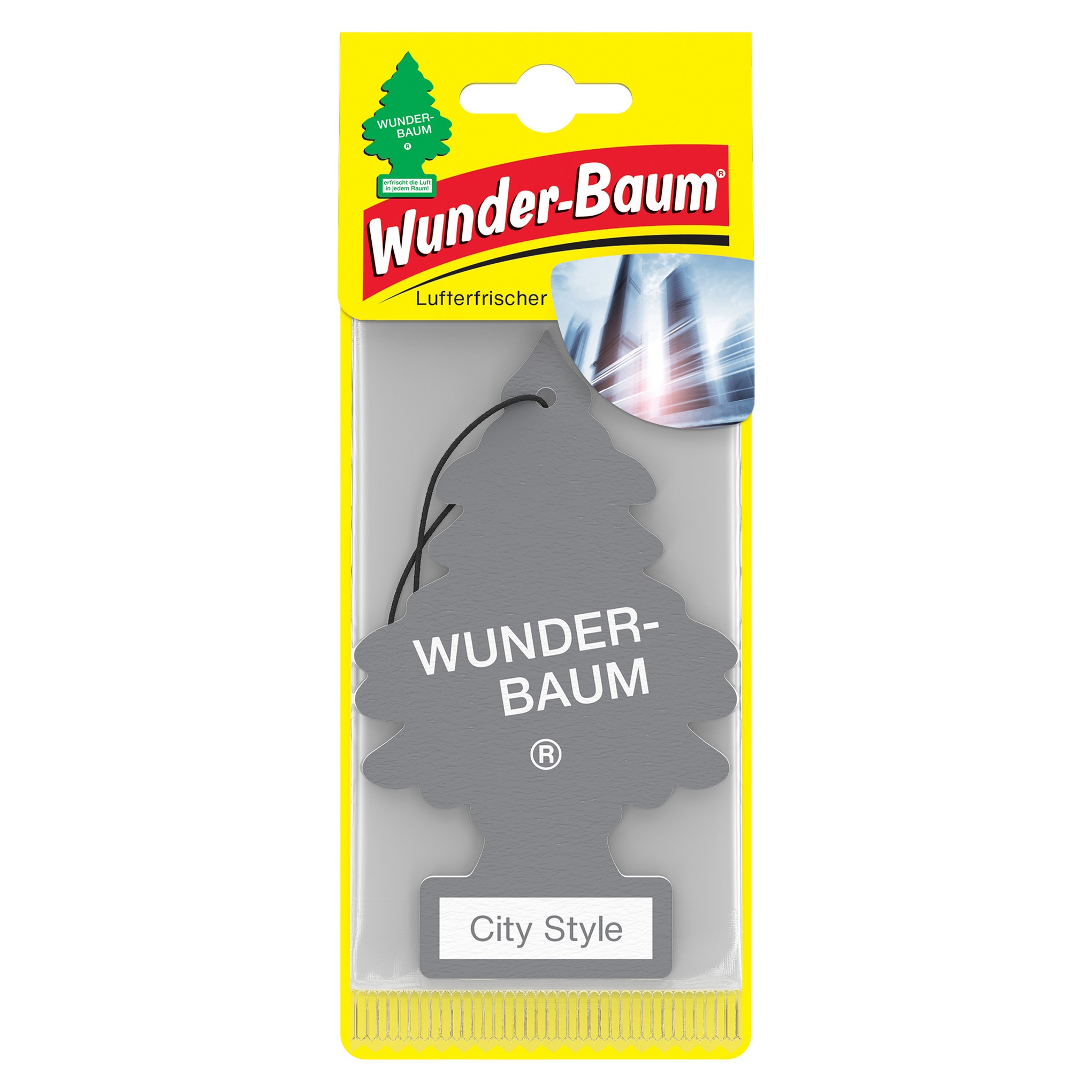 WUNDER-BAUM papierowy zapach samochodowy w kształcie choinki. Utrzymujący się do ośmiu tygodni aromat. Skutecznie neutralizujący nieprzyjemne zapachy np. dymu tytoniowego, wilgoci. „City Style” to wyrazisty, męski zapach z nutą drzewa sandałowego. Prawdziwa miejska elegancja.