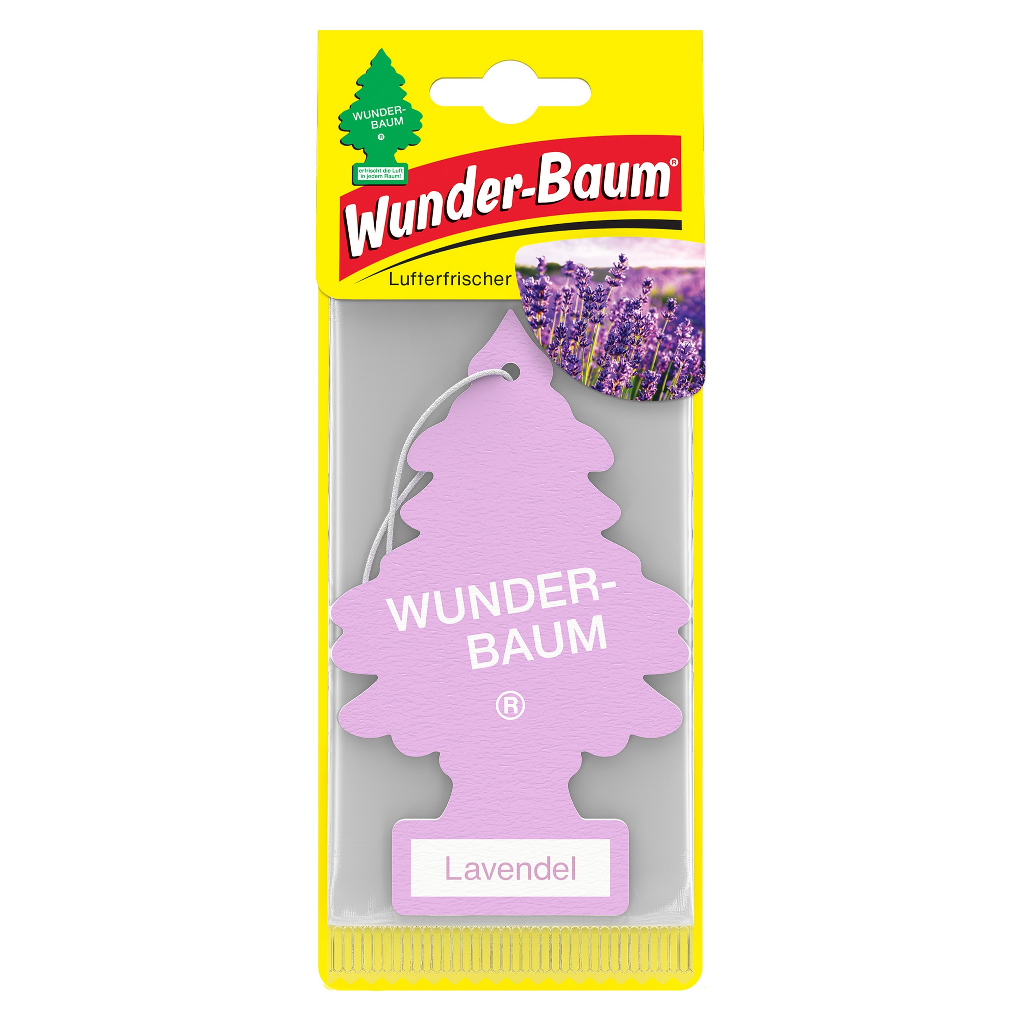 WUNDER-BAUM papierowy zapach samochodowy w kształcie choinki. Utrzymujący się do ośmiu tygodni aromat. Skutecznie neutralizujący nieprzyjemne zapachy np. dymu tytoniowego, wilgoci. Odprężający zapach w wersji – Lawenda.