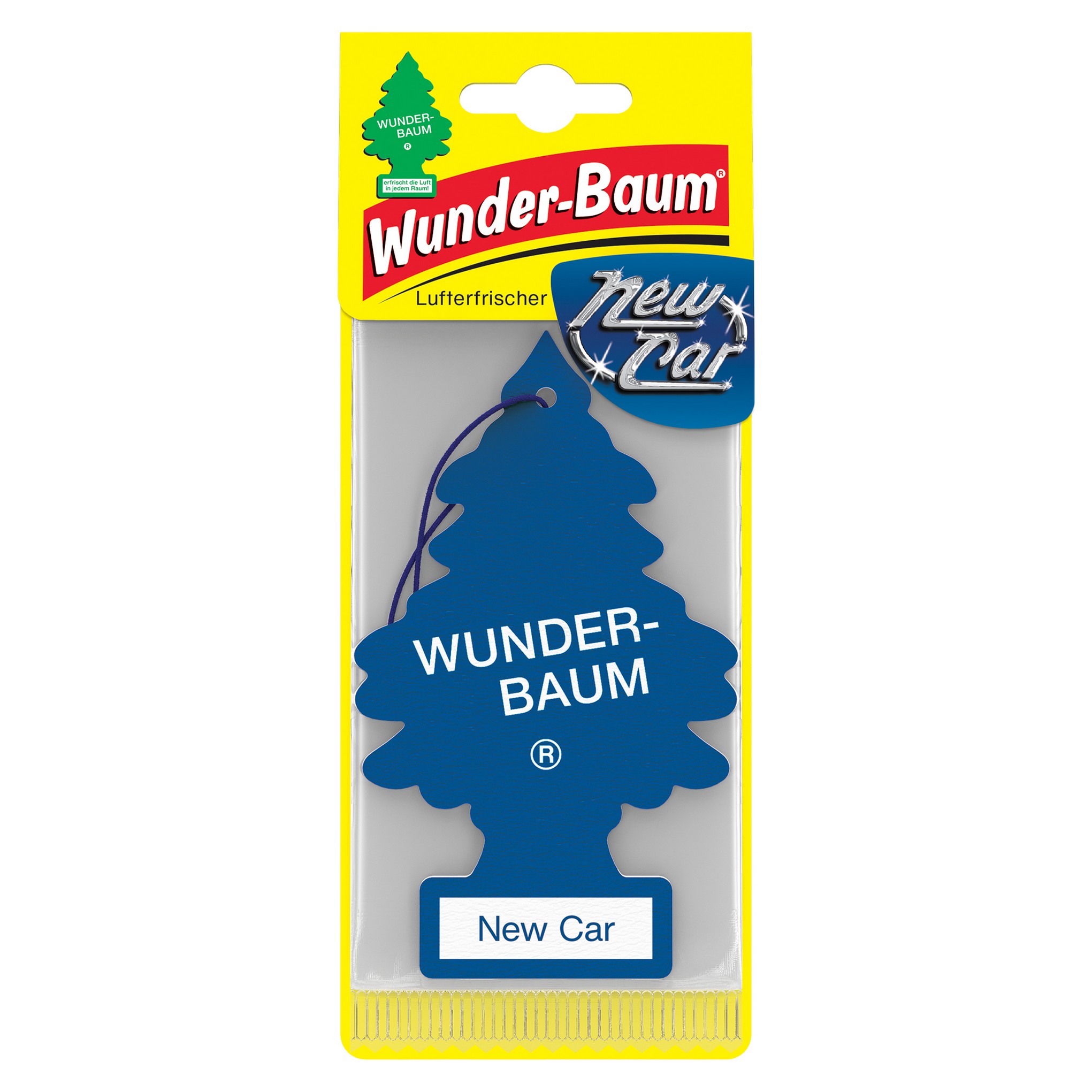 WUNDER-BAUM papierowy zapach samochodowy w kształcie choinki. Utrzymujący się do ośmiu tygodni aromat. Skutecznie neutralizujący nieprzyjemne zapachy np. dymu tytoniowego, wilgoci. Zapach „Nowy samochód”